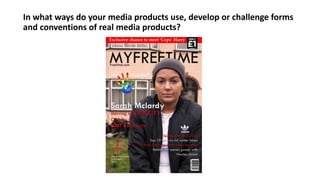 1. The document discusses conventions used in magazine covers and how the student's media product follows or develops these conventions. Key conventions included are mastheads, barcodes, prices, cover lines, main images, and skylines.