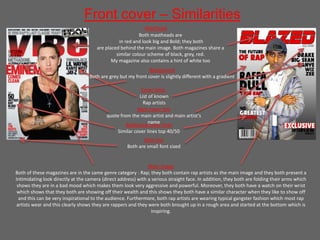 1) The document summarizes the similarities and differences between the front cover of the student's media product and the front cover of an existing magazine called "The Vibe." Both magazines share conventions like mastheads, cover lines, and featuring intimidating images of rappers. However, the student's cover lacks a strap line and puff that "The Vibe" uses.