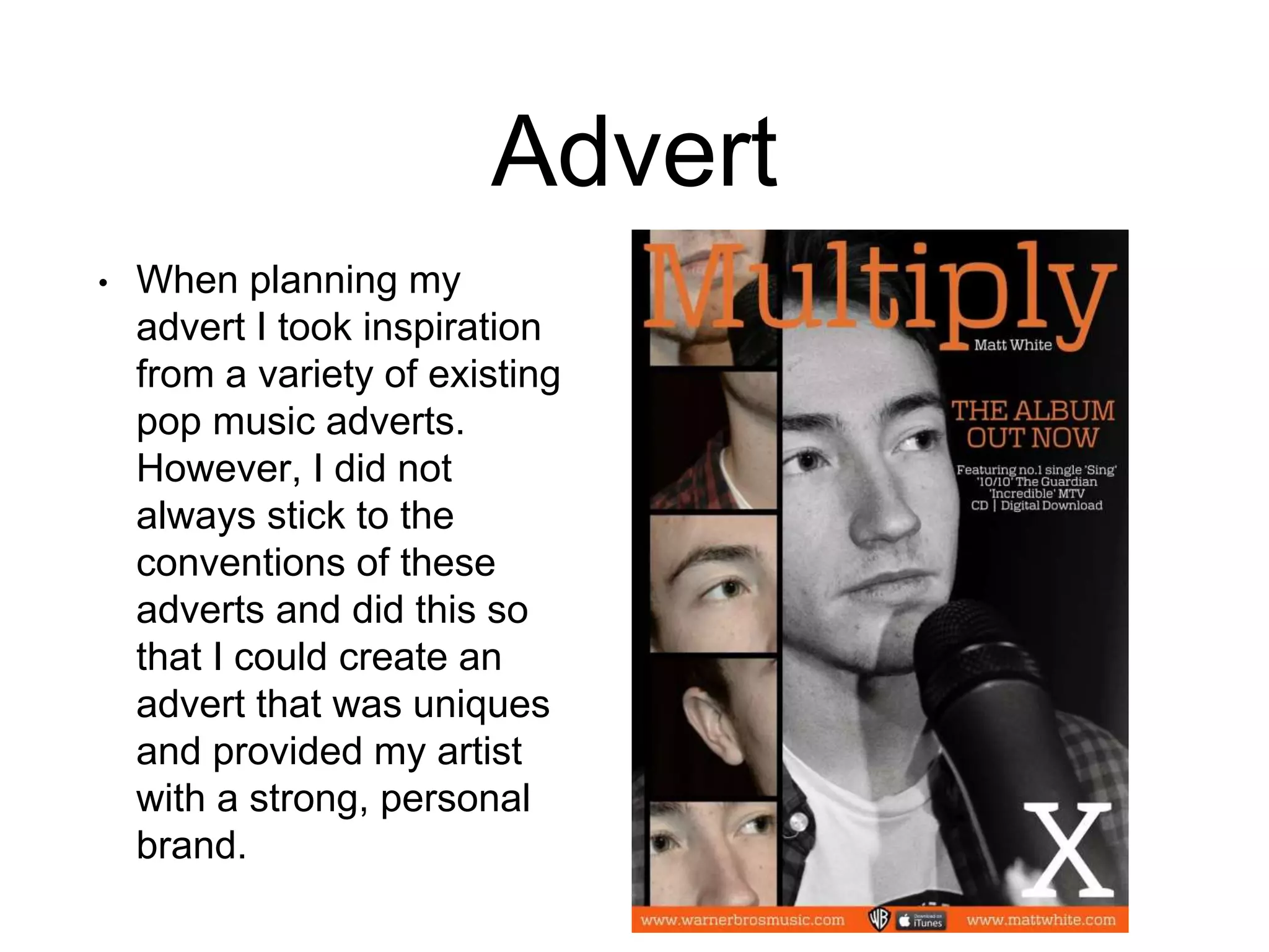 My advert uses conventions like including the artist's headshot and website. It develops conventions through a geometric collage design and subtle artist name. It challenges conventions by using a small artist name and focusing on the album release over the artist.