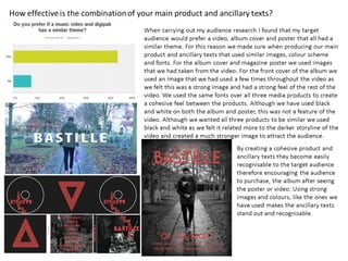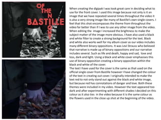 The document discusses the design choices made for the front cover of a digipak and poster for a music video. For the cover, an image was selected that was prominently featured in the video and encompassed its overall theme. The image brightness was increased and a black and white filter applied to create a strong background for the text. Black and white was chosen to represent the binary oppositions explored in the narrative. The text color was adjusted from red to a different shade that tied to elements in the video. The poster uses a similar shot to what was in the video to make it recognizable while still including familiar elements, and also applies a black and white filter for cohesion.