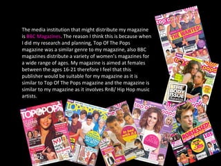 BBC Magazines would be a suitable publisher for the student's music magazine because it distributes magazines similar in genre to the student's magazine, including Top of the Pops magazine. BBC Magazines also publishes various women's magazines for a wide range of ages, matching the target demographic of females aged 16-21 for the student's magazine focused on RnB and hip hop artists.
