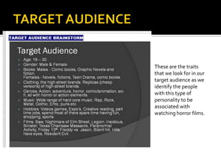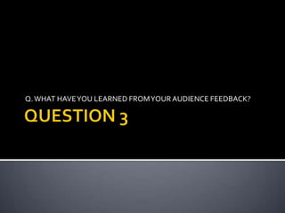 The document summarizes feedback received from the target audience of a horror film trailer and final products. It discusses conducting a questionnaire to understand perspectives of different gender and age groups. Responses to horror film mentions helped inspire the products. Allowing audiences to choose design elements showed their input. Feedback highlighted that the trailer told an easy to understand story through dramatic beginning, effective music and sound, and relationship of clips. Viewers also commented on lighting, acting, and how it built tension to make them want to watch the full film.