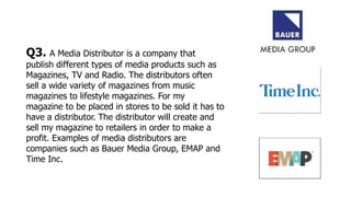 Bauer Media Group would be the best media distributor for my dance music magazine. Bauer is a large European company that distributes over 300 magazines across 15 countries, including music magazines like Kerrang. Though Bauer doesn't currently focus on dance music magazines, distributing my magazine could be a good opportunity for them to target a new audience. EMAP, which is now owned by Bauer, may be less suitable as they specialize more in business publications. Similarly, while Time Inc. publishes music magazine NME, it targets an older, more mature audience that differs from my intended younger audience.
