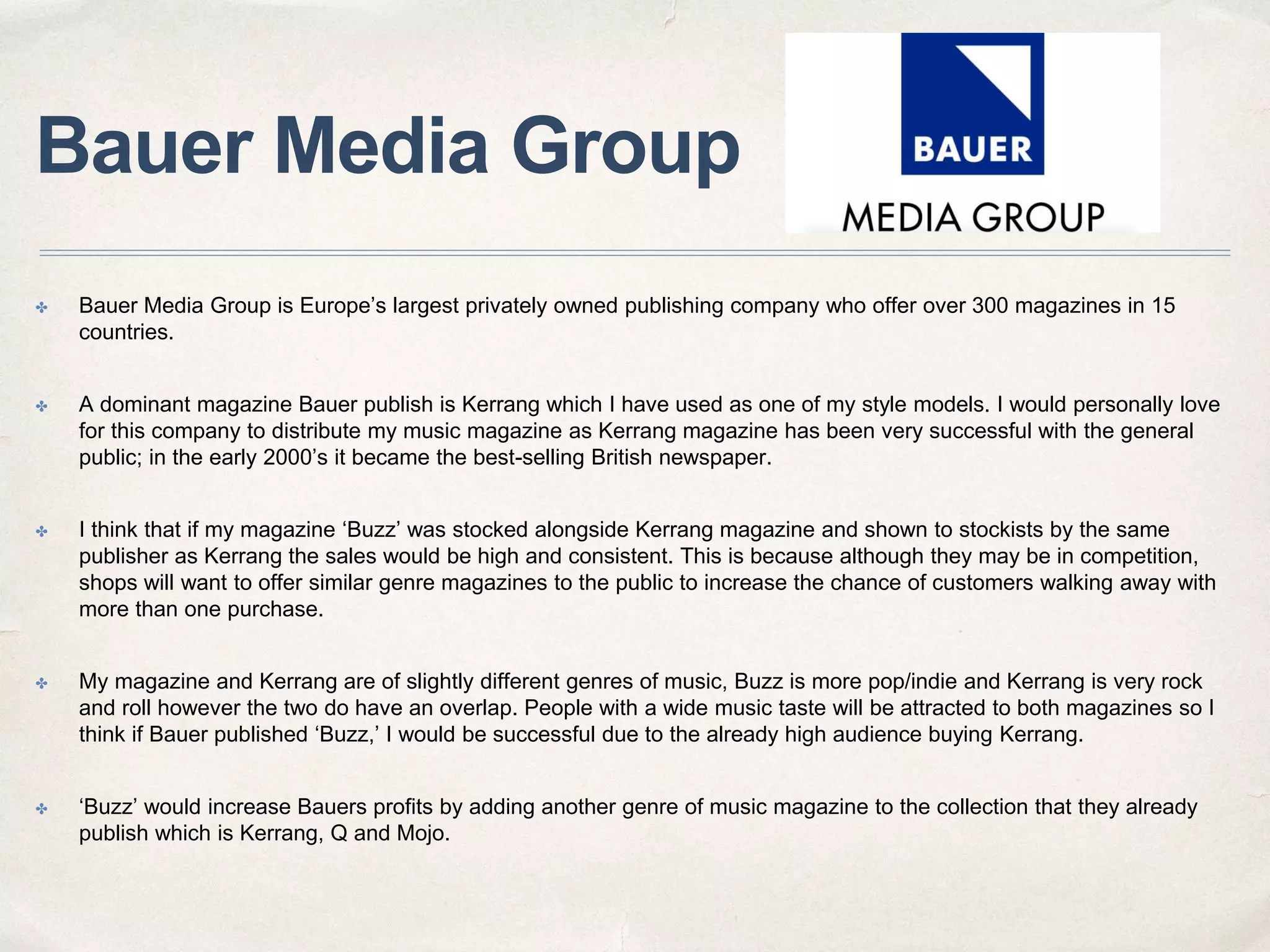 Hannah Wood evaluates potential distributors for her music magazine 'Buzz,' identifying Bauer Media Group and Time Inc. UK as prime candidates. Bauer, known for Kerrang magazine, could enhance sales through genre overlap, while Time Inc. boasts substantial readership with successful titles like NME, ensuring high visibility for 'Buzz.' Both institutions would benefit from diversifying their magazine portfolios, potentially increasing profits.