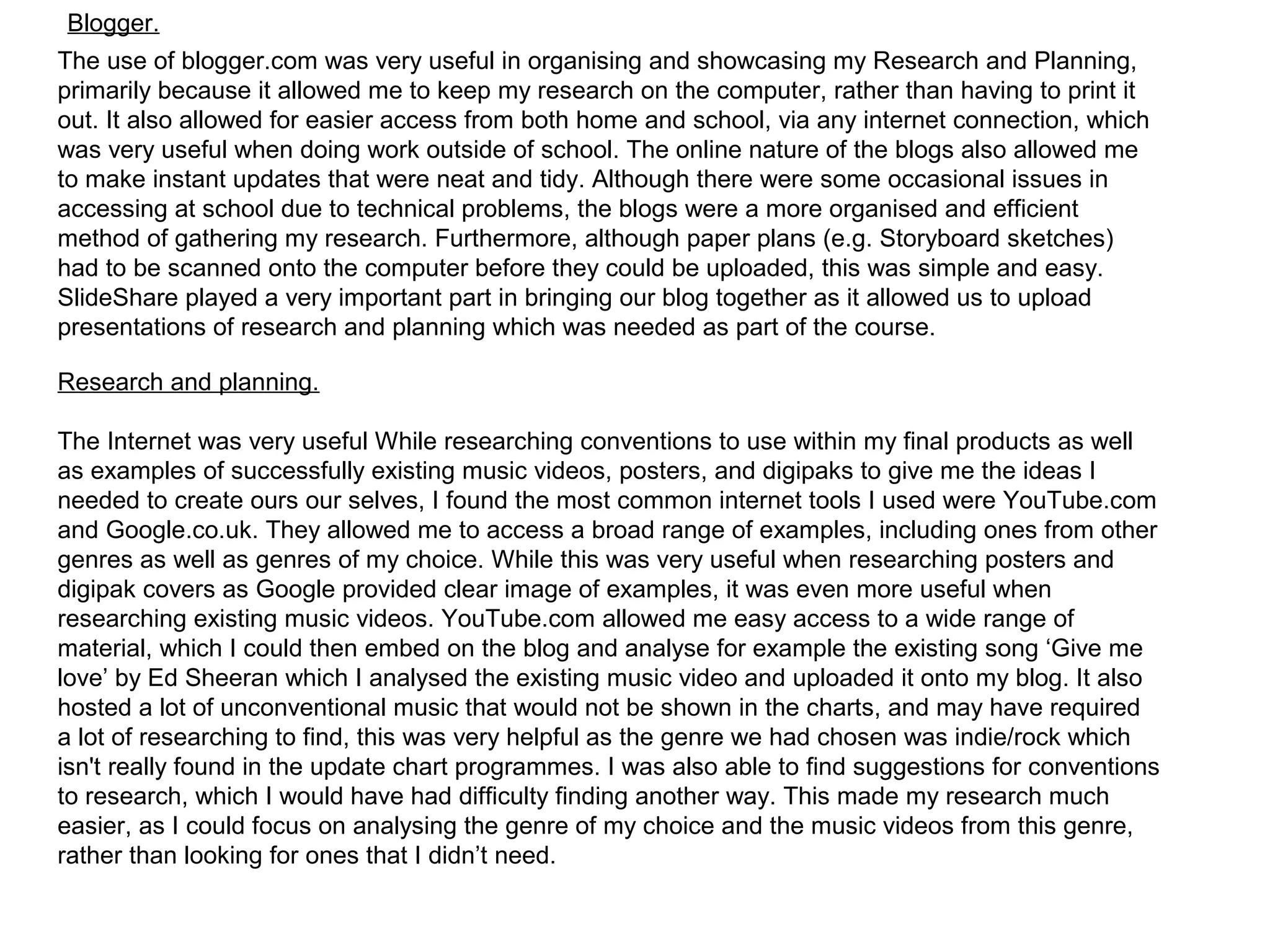 The document discusses how new media technologies were used at different stages of a project. Blogger was used to organize research and plans by keeping work online and accessible from different locations. YouTube and Google allowed easy access to music video examples for analysis and genre research. Adobe Premier was used to edit video footage and construct the final music video, applying effects to achieve the desired indie/rock genre style. Photoshop assisted in designing album covers and posters by editing images and blending elements together. Prezi was also utilized to create a more complex presentation for the evaluation.