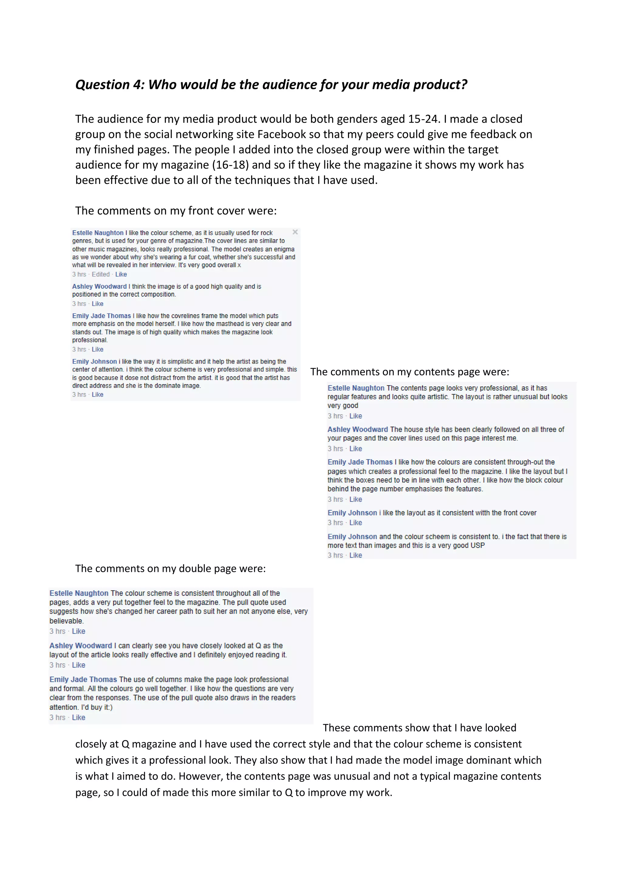 The document discusses the target audience and feedback received for a media product created by the author. The target audience for the magazine was both genders aged 15-24. The author created a closed Facebook group with peers within that age range to provide feedback on finished pages. Comments on the front cover, contents page, and double page spread showed the author captured the style of Q magazine correctly and used a consistent color scheme, giving the work a professional look with a dominant model image as intended, though the contents page was unusual compared to Q.