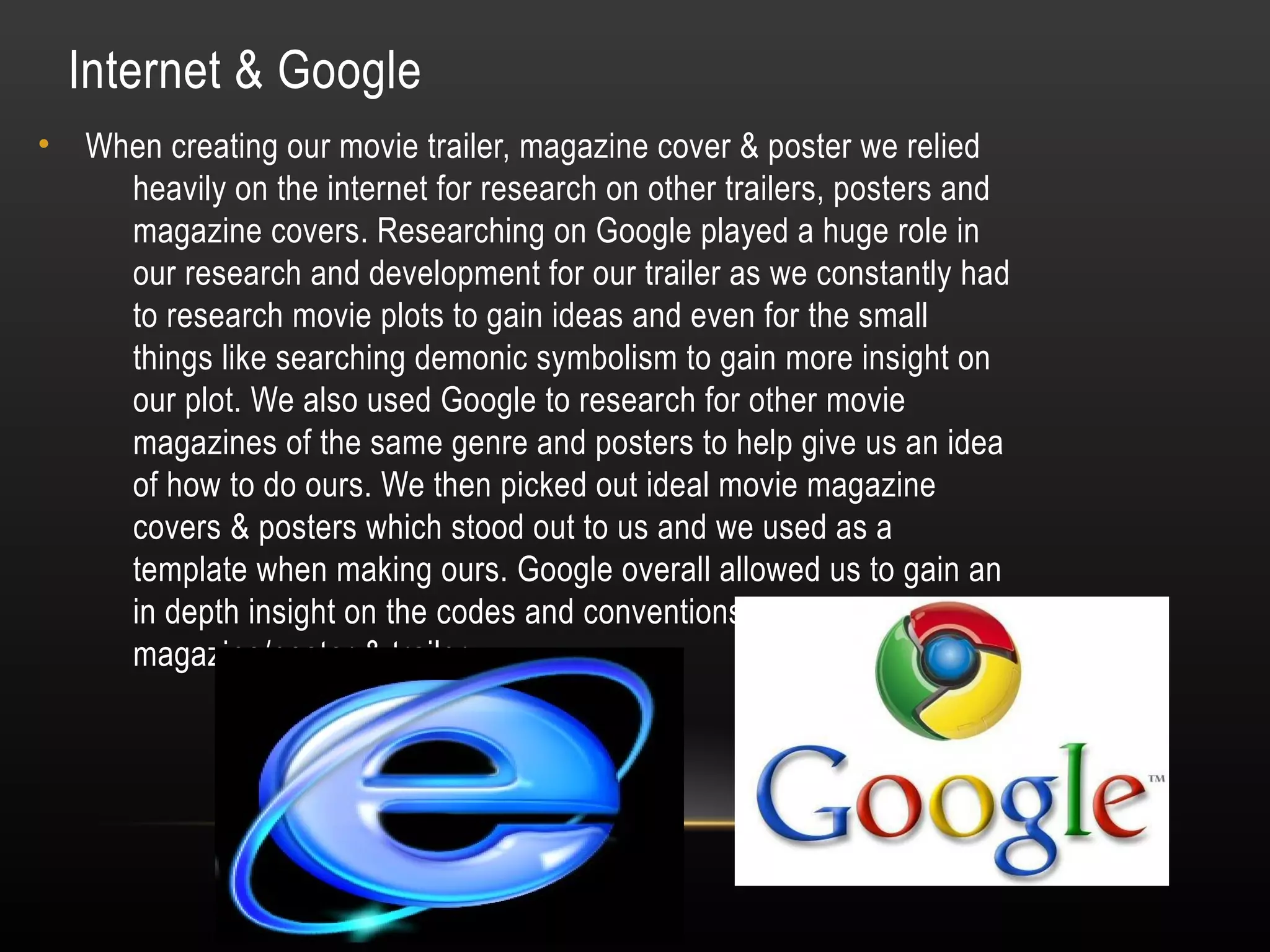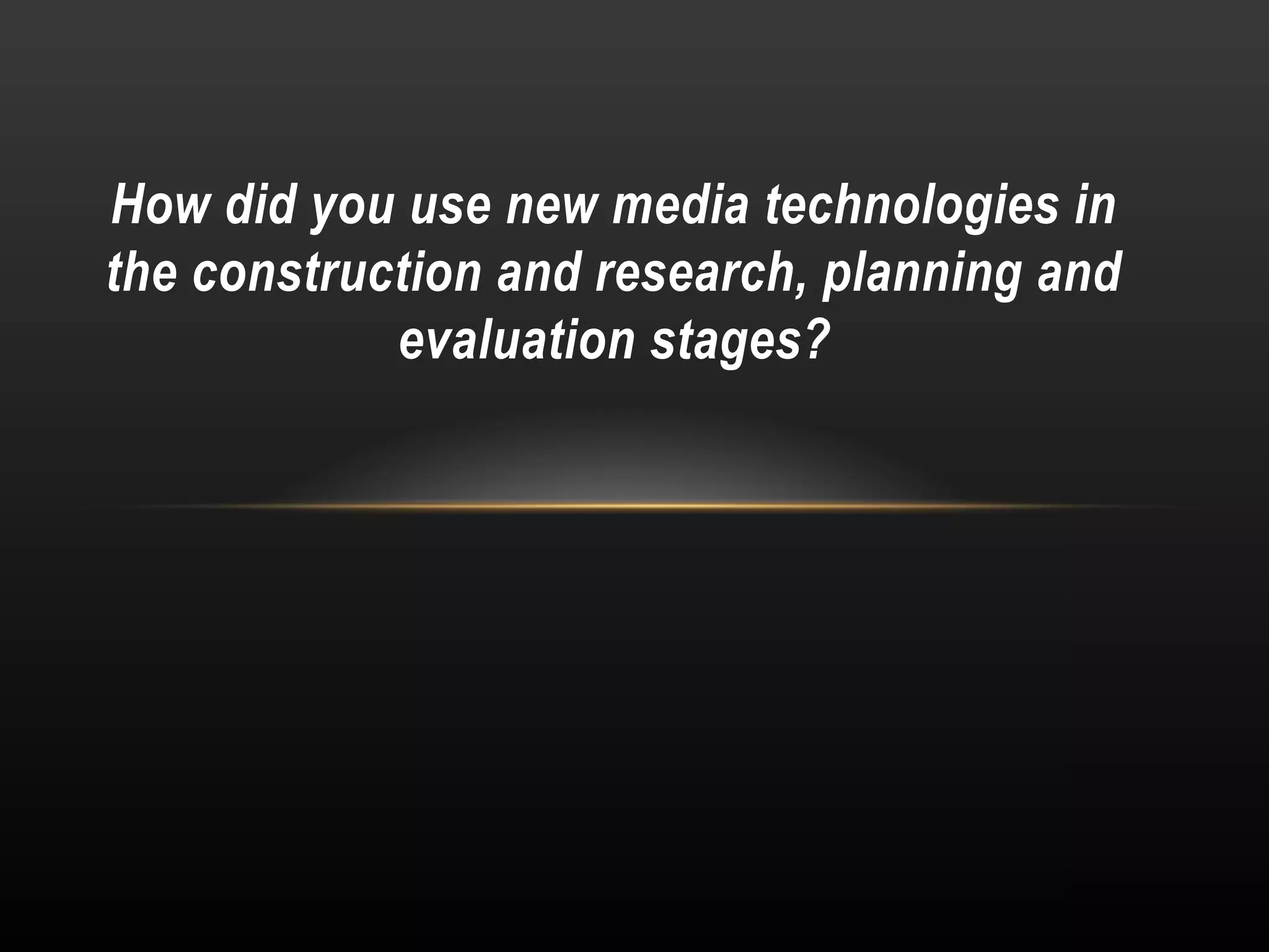 The document discusses the use of various new media technologies in creating, researching, planning, and evaluating a movie trailer, magazine cover, and poster. Google was used for general research on movie plots, symbols, and analyzing other similar media texts. YouTube provided inspiration from other trailers and ideas for shots and sounds. SlideShare, Prezi, and databases allowed for analyzing media texts and planning ideas. Blogger documented the process. Filming equipment like cameras, microphones, and lights were used to capture footage. Adobe Premier and Photoshop allowed for editing videos and images by adding effects and cropping out flaws. Various technologies like Prezi, blogs, and SlideShares were used to evaluate the projects.