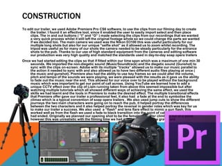The document describes the process of editing a trailer using Adobe Premiere Pro CS6 software. Key features of the software like importing clips, selecting in and out points, and using multiple audio tracks are discussed. Various techniques were used like adding transitional effects, jump cuts, and color corrections to achieve a professional look matching soap opera standards. Skills learned from creating ancillary products in Photoshop like adding special effects and manipulating photos were also applied.