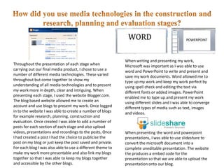 The document discusses the various media technologies used at different stages of a media project. At the planning stage, email, digital cameras, Google Maps and weather websites were used. Microsoft Word, PowerPoint and SlideShare were used to write, present and publish documents and presentations. Blogger was used to create blogs to present each stage. YouTube, music websites and magazines were used for research. iMovie was used to edit video clips and add effects. Images were edited using selection tools. Fonts were found on Urbanfonts. Feedback was gathered from YouTube and Facebook comments.