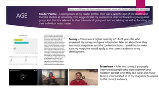 This document discusses the target audience for a media product based on evaluation of the audience's age, gender, and class. It was determined through a reader profile, survey, and interviews that the target age group is 18-24 year olds. The survey showed a higher response from females, so the product focuses more on appealing to females while also encouraging male interest. Various elements were incorporated like a young female model, popular music, and bright colors. Pricing the product at £3.50 targets a middle-class audience based on affordability. Elements like style of clothing and pricing make the product appealing while representing trends of the middle class.