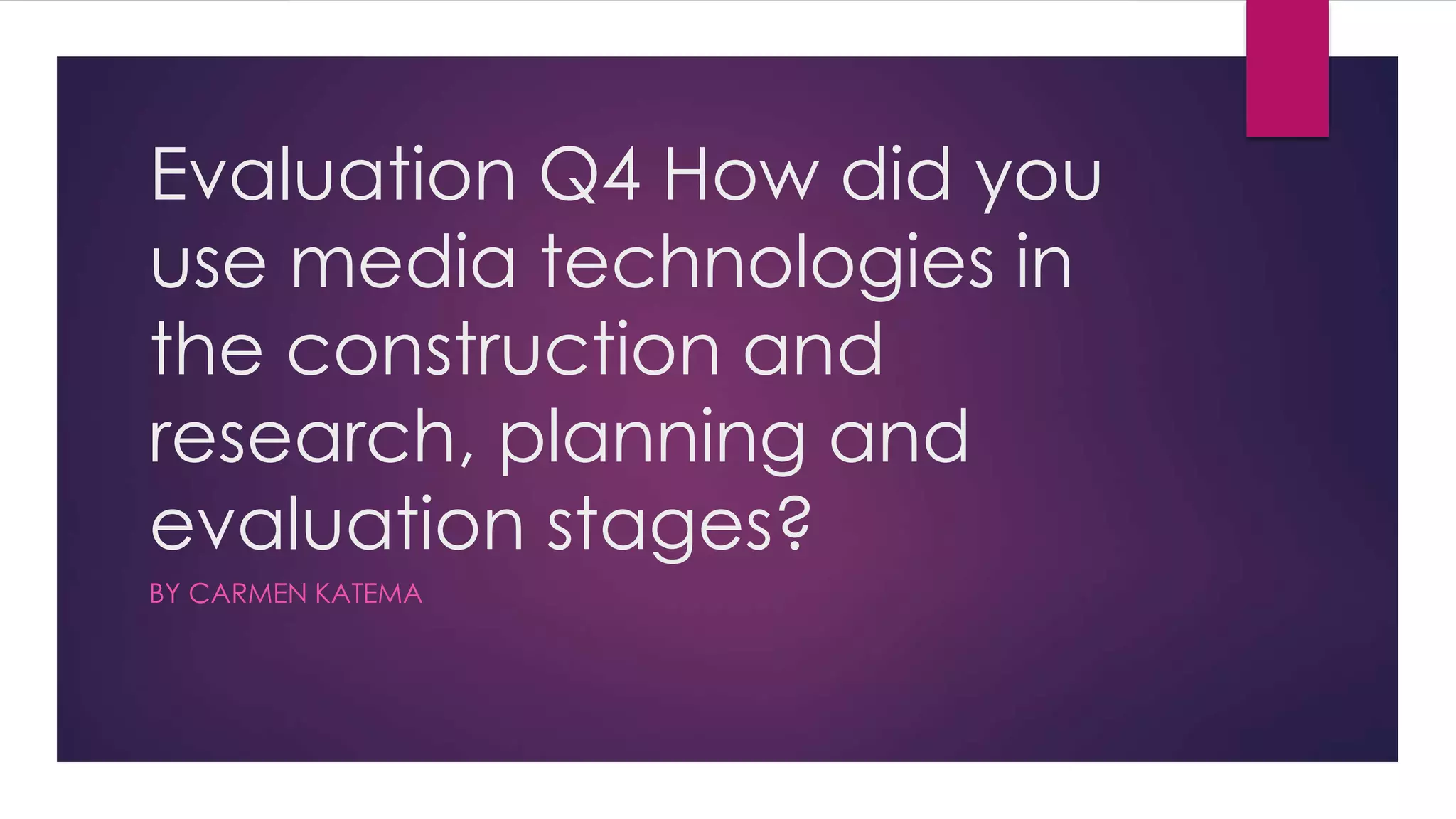 Carmen Katema used various media technologies throughout the planning, research, and evaluation stages of her project. She used YouTube to research music videos in the synthpop genre for inspiration and to identify conventions of the genre. Final Cut Express was used to edit her main video product after gaining experience editing a practice video. Blogger allowed her to document her progress for her teacher. Google was primarily used for research, such as finding appropriate props and researching record labels and advertising styles. Photoshop was used to edit ancillary texts and experiment with fonts. Filming equipment like a camera, tripod, and dolly were used to film her music video.