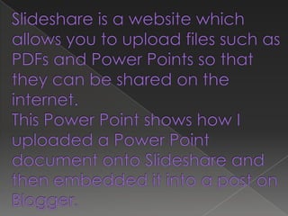 The document describes the process of uploading a slideshow presentation to SlideShare and then embedding it into a blog post on Blogger. The key steps are: uploading the document to SlideShare, editing the category to "Education", copying the embed code, creating a new blog post on Blogger, pasting the embed code into the post and publishing it.