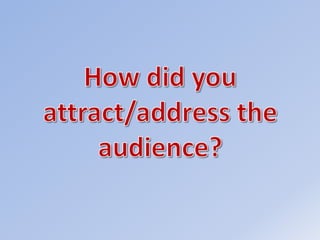The document discusses the filmmakers' rationale for giving their film a 15 certificate. They felt a 15 rating was appropriate as other similar thriller films had this rating, and their film's content of death, tension, mild violence and swearing would also fit this category. They aimed to attract a teenage audience as the main character and themes could be relatable to teenagers, addressing aspects of teenage life. They created tension through uncopyrighted creepy music, added heartbeats and sudden blackouts at high tension points. Finally, the filmmakers wanted their small, low-budget film to target a smaller, cult following by distributing through a company that shows similar small films rather than large blockbusters.