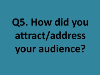 To attract readers, the document discusses using a limited color palette, consistent masthead and house style across pages, relevant images of popular artists, and interactive content like competitions. Maintaining visual continuity across the front cover, contents page, and double page spread makes the magazine look professional and appeals to the target audience's interests. Placing artist images and titles prominently helps entice readers and promote the featured content.