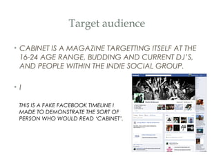 The document discusses how the magazine Cabinet attracts its target audiences of 16-24 year olds, DJs, and budding DJs. It aims to appeal to 16-24 year olds through its strong online presence and social media, its young cover model, and photo manipulation style popular with that age group. It appeals to DJs by using language related to DJing, robotic fonts that look technological, and offering free DJ software to subscribers. The chosen cover photo of the model makes direct eye contact and poses him in a way resonant of the genre.
