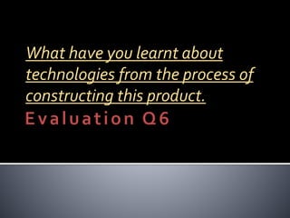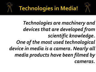 This document discusses the technologies used to create a media product. It explains that cameras are essential for filming shots and scenes. Software like Adobe Premiere Pro is necessary for editing together the various shots. Other technologies mentioned include flip cameras, phones for communication, Apple computers running software, YouTube for research, and social media for promotion. The conclusion is that no single technology is most important, but rather they all must work together - filming is useless without editing capabilities, and editing requires raw footage to work with.