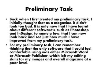 The student felt their preliminary magazine task lacked polish since they only used Microsoft Word and Publisher. Through learning Photoshop and InDesign in the course, they have significantly improved their editing, design, and layout skills. Their knowledge of software like Photoshop and InDesign was very limited before, but now they feel confident using these programs to create more complex magazines that better meet their target audience's needs and preferences.