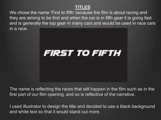 This document analyzes how the film opening uses and develops conventions of motorsport films in its forms and techniques. It summarizes that the title "First to Fifth" references the races and gears. Font and timing of the title card follow conventions. Credits are ordered by importance and use slanted font for speed. Settings include race tracks and pits to match genres. Costuming includes a racing suit. Camera work uses close-ups and match cuts. Editing uses filters to show past events and a fast pace to build tension as in Fast and Furious. Locations were limited but conventions were still attempted.