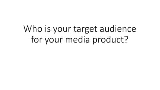 This document discusses establishing a target audience for a horror film media product. It considers age ratings from the BBFC and determines a 15 rating is most suitable as the film contains threat and horror but no sustained focus on sadistic or sexualized threat. A 12A rating was deemed too limiting. Research showed the target audience is ages 15-25, with both male and female viewers interested in psychological horror, the intended genre of the film.