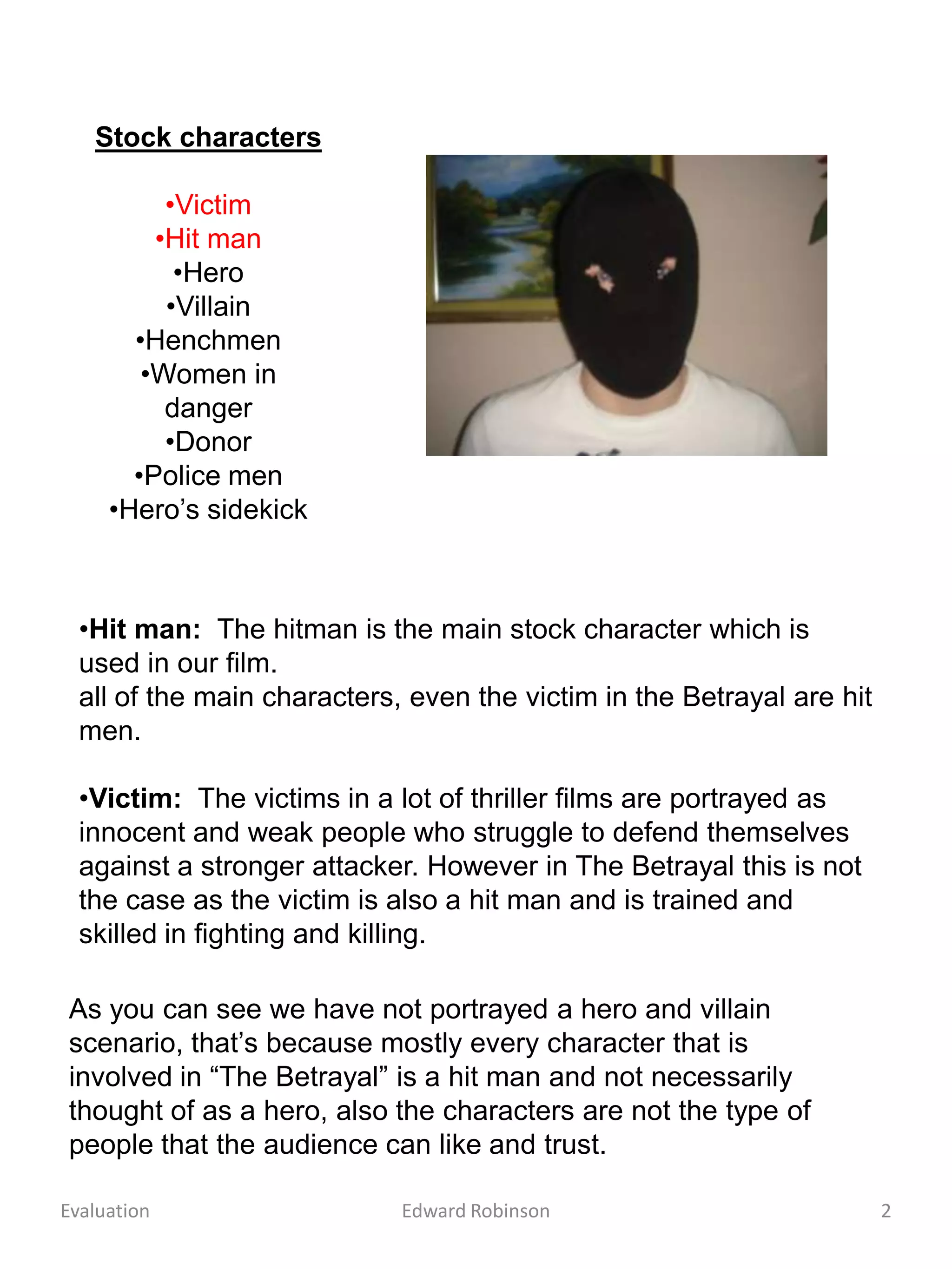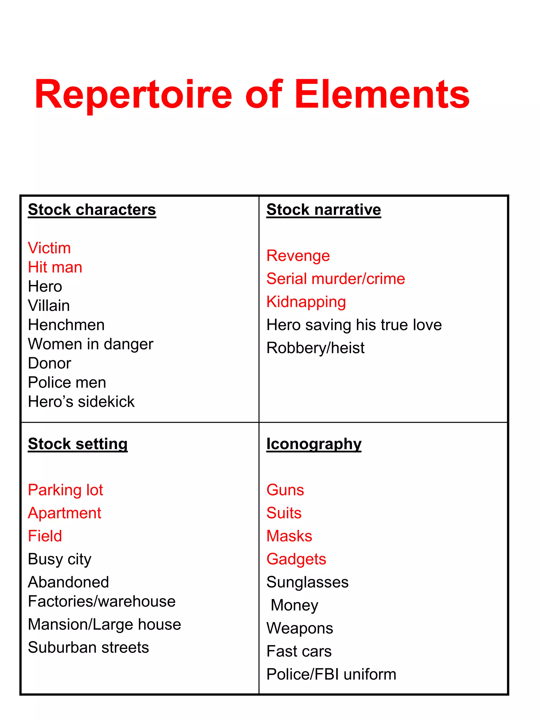 The document describes common stock elements used in thriller films, including characters, narratives, settings, and iconography. Some key stock characters mentioned are the victim, hit man, hero, and villain. Common stock narratives include revenge, serial murder/crime, kidnapping, and hero saving his true love. Typical stock settings listed are parking lots, apartments, fields, cities, and warehouses. Iconography elements often seen include guns, suits, masks, gadgets, money, weapons, and fast cars.