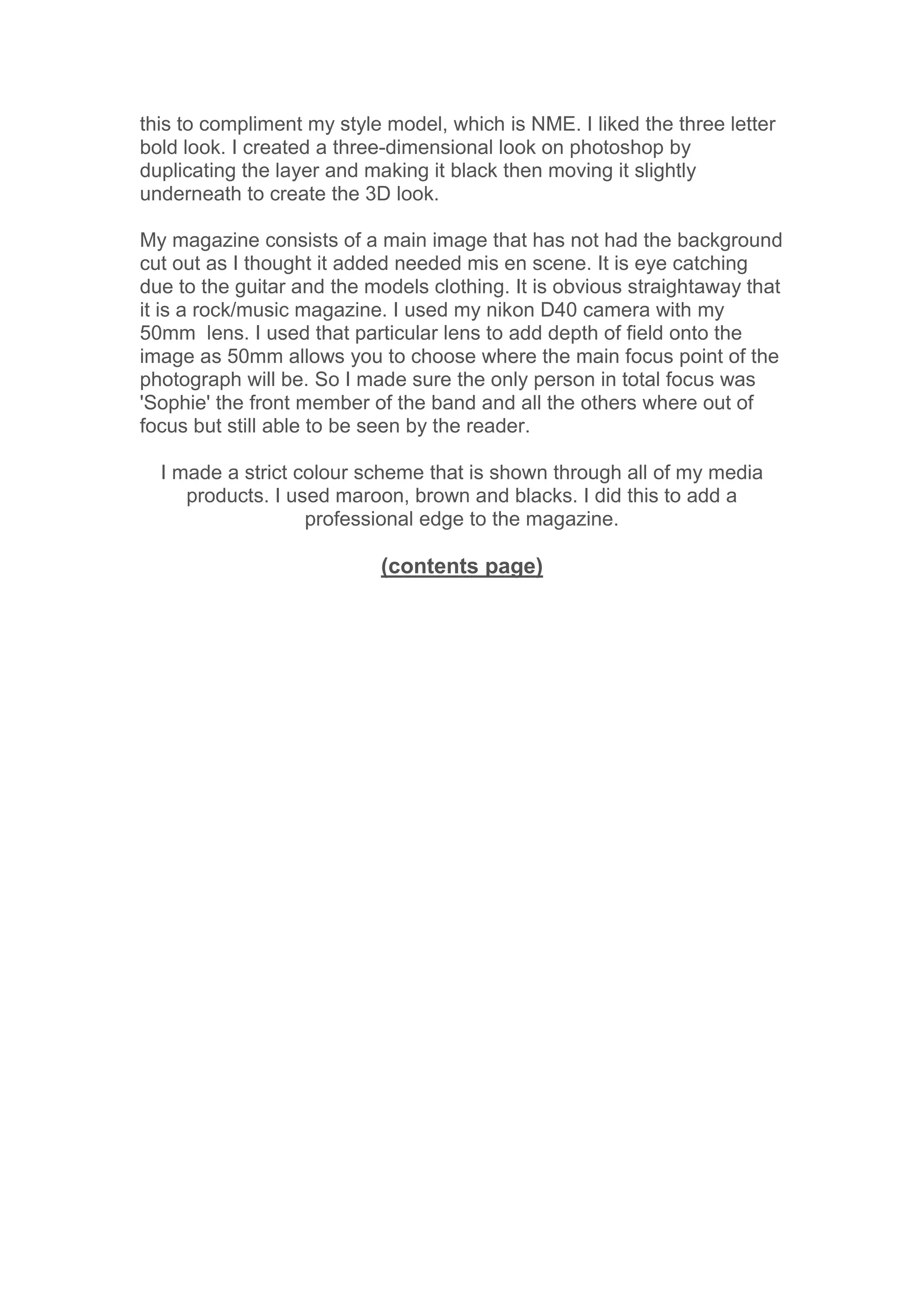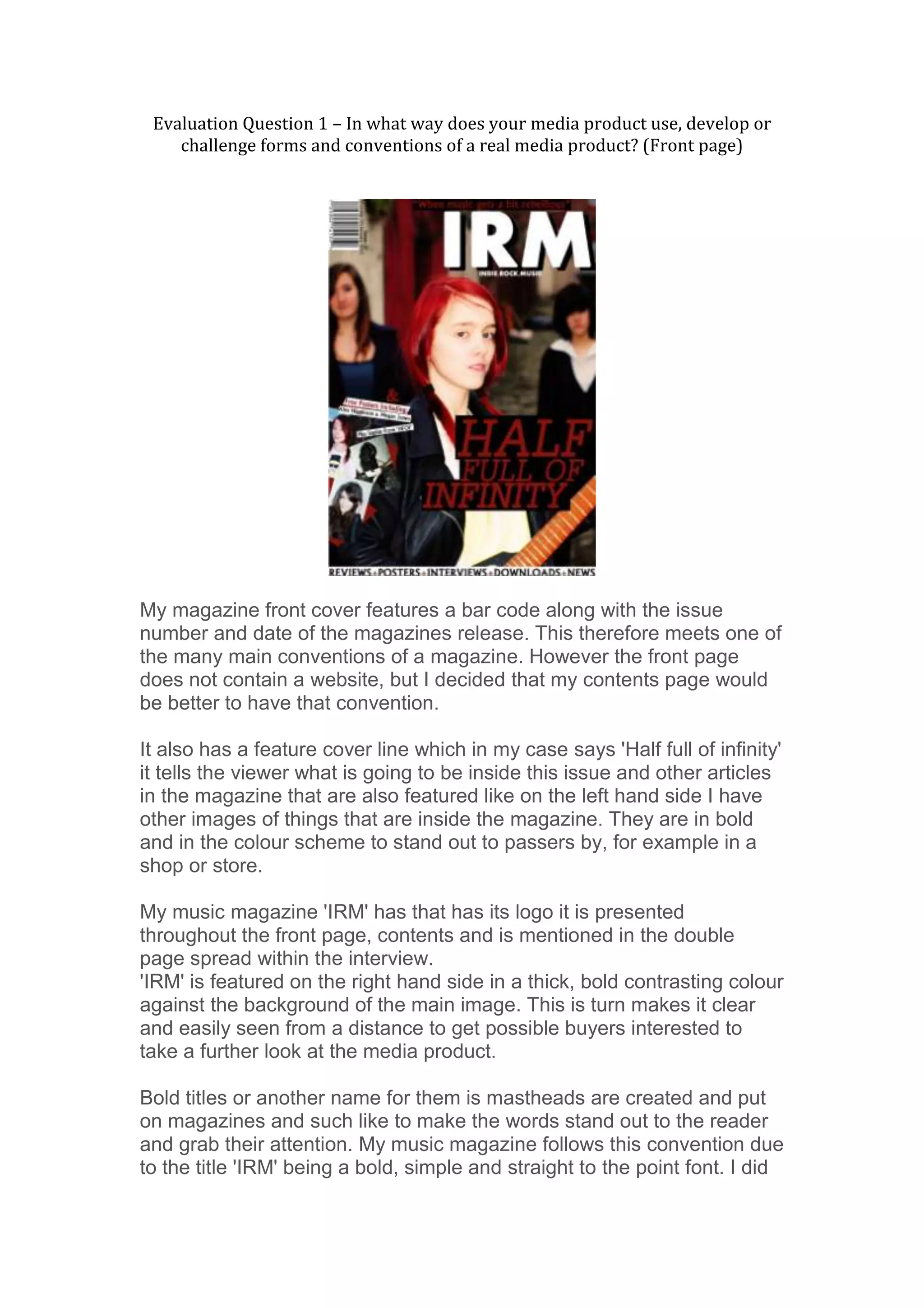 The document discusses how the student's magazine front cover, contents page, and double page spread use conventions of real media products. The front cover includes features like the issue number/date and a masthead. The contents page includes the website, masthead, and layout of content previews. The double page spread includes information about the writer and photographer, continues the color scheme and style, and includes a bold band name masthead and subheadings. Throughout the magazine, conventions like consistent branding, color schemes, and photography style are followed.