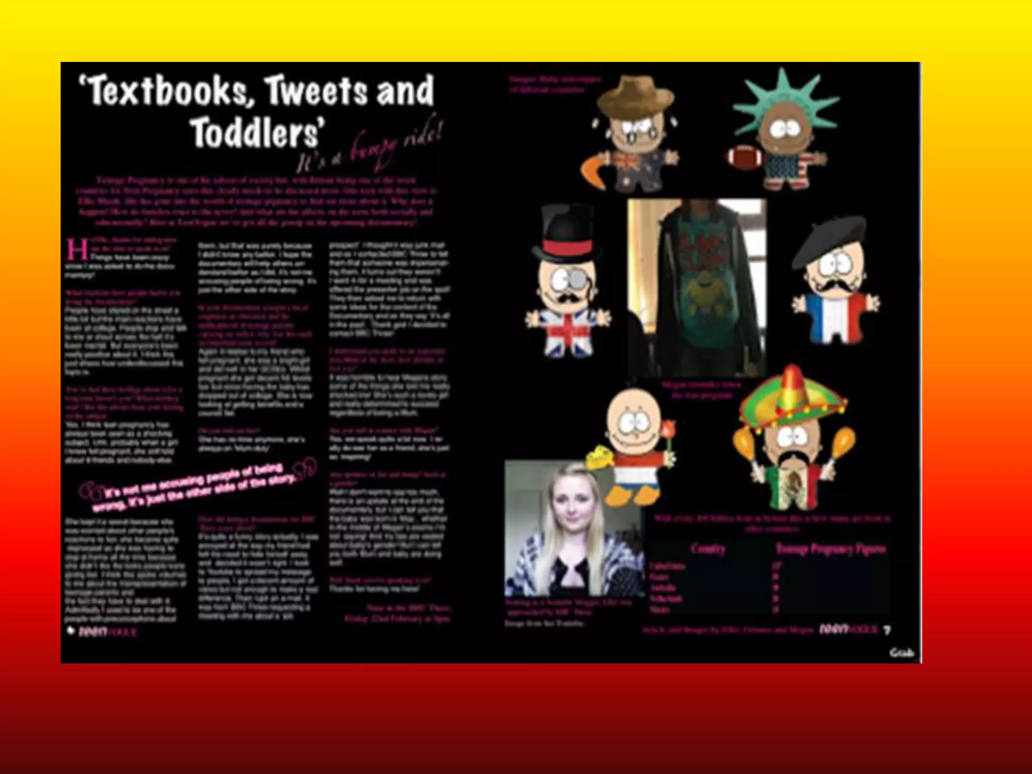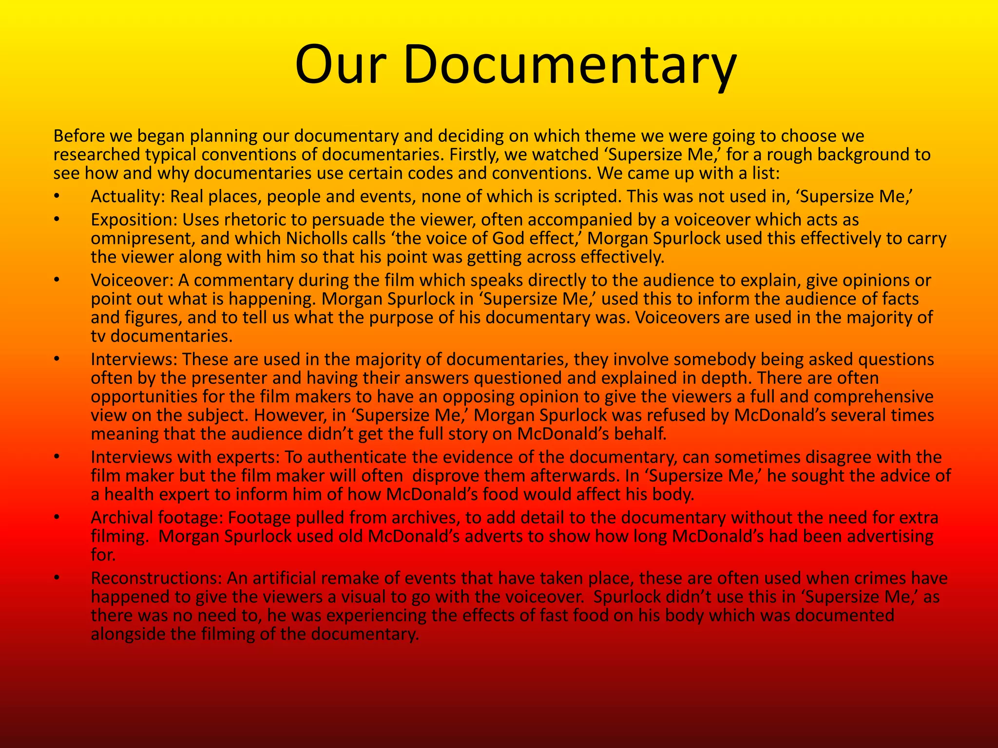 Our documentary uses several conventions of documentary films including actual footage, exposition through a voiceover, interviews, and establishing shots. We filmed using a tripod for a professional look and employed techniques like panning shots, music, and graphics to support the persuasive expository style. To promote the film, we created a magazine article for Teen Vogue using conventions like a masthead, pull quotes, and advertising. We also made a 30-second radio trailer with upbeat music to match typical trailers and link to the documentary.