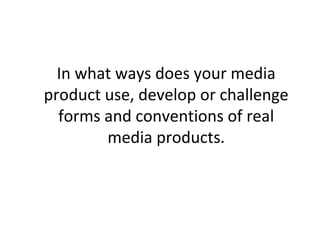 The student researched real newspaper conventions like masthead styles and front page content when developing their media product. For the masthead, they used a bold red font that was different from the typical "Times New Roman". Advertisements were placed beside the masthead to avoid drawing attention away from the content. The main article used a dark headline font and image to set a serious tone, following real newspaper conventions. Advertisements were included throughout and focused on local businesses to be relevant to the target audience. The layout and variety of advertisements matched a real local newspaper for clear reading.