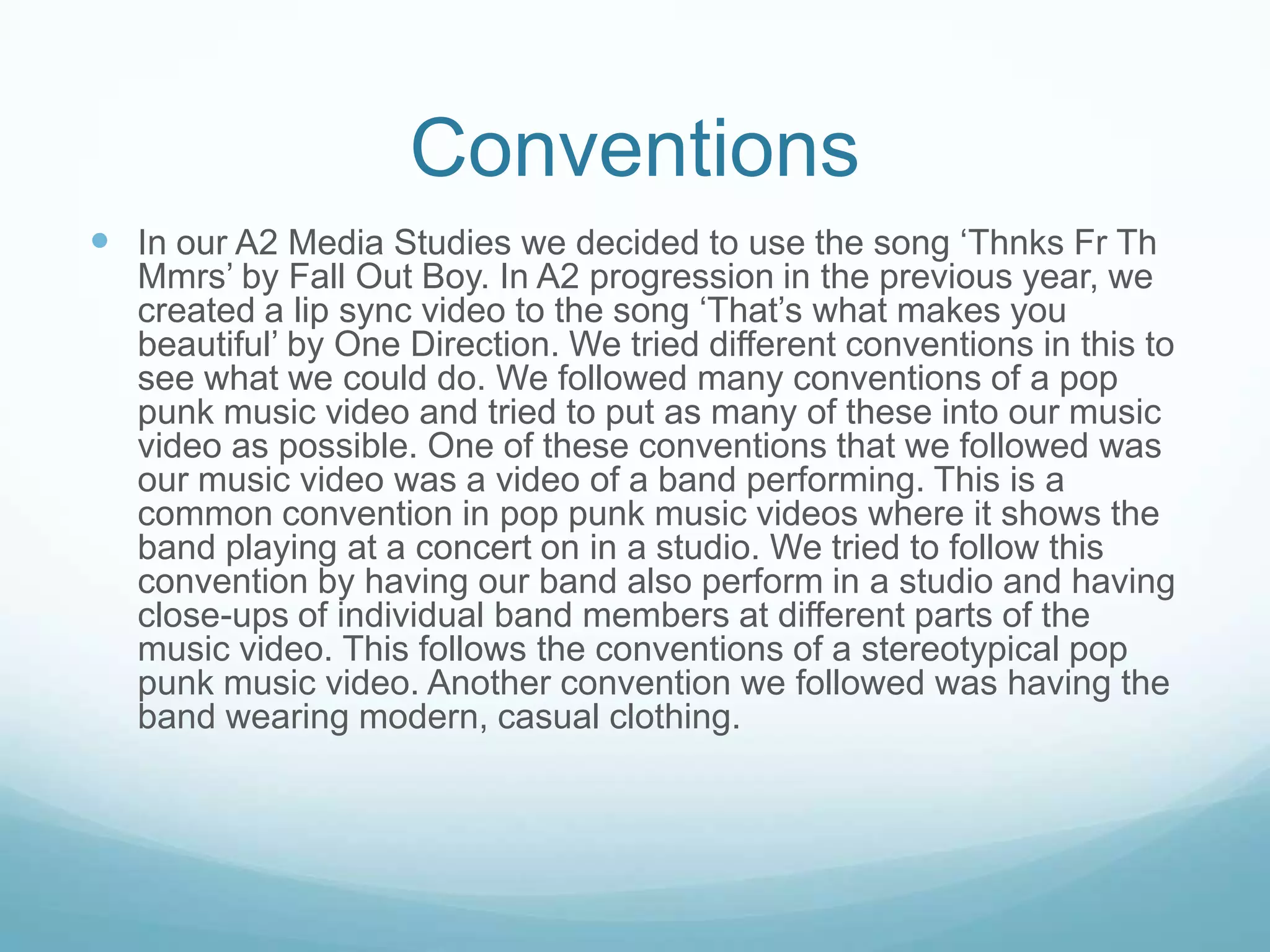 The document discusses a student media project creating a music video for the song "Thnks Fr Th Mmrs" by Fall Out Boy. It followed several conventions of pop punk music videos, such as showing the band performing in a studio and wearing casual clothing. It developed some conventions by including memories that coordinated with the song's lyrics. However, it also challenged conventions by adding black-and-white photoshoots of the band, which are uncommon in pop punk videos. The video related to theories about visuals linking to lyrics and focusing on the star image of the lead singer.