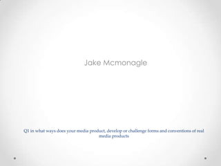 The document discusses how the filmmaker's teaser trailer for a comedy film follows conventions of the genre while also challenging some conventions in certain areas. It analyzes how the teaser trailer sticks to conventions for costumes, props, camerawork, editing, fonts and establishing the story and genre. However, it introduces characters in a non-conventional way by displaying their names on screen rather than in a title sequence as seen in films it researched. Overall, the teaser trailer aims to resemble typical "lads holiday" comedy films but puts a unique spin on introducing characters.