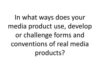 This document discusses the student's music video coursework and how it uses conventions of real media products. The student researched existing successful music videos to understand conventions like narrative and performance styles. Their video follows these conventions, using elements like lighting, cinematography, mise-en-scene, and others to effectively portray the artist and elicit emotion from the target audience. The student analyzes how their use of conventions like close-ups, costumes, and simple lighting and settings help achieve their goals and will appeal to viewers familiar with similar music videos.