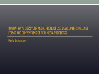 This document discusses conventions of the gangster-crime genre including stock narratives, characters, settings, and iconography. It then summarizes how the student media project used and developed some of these conventions. Specifically, it developed the recruiting of a new gang member by having the recruit rise to the top of the gang. It also challenged the tradition of close family bonds by portraying the gang boss as ordering around his brother instead of treating him as dear family. Upon evaluation, the students felt they should have paid more attention to the family tradition and included more iconic symbols.