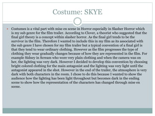 1. The costume, characters, narrative, sound, and shot types in the film trailer challenge some conventions of horror films while developing or maintaining others.