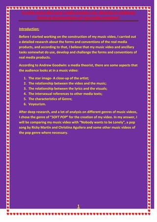 The document discusses how the media producer's music video both uses and challenges conventions of real pop music videos. It uses conventions such as portraying the artist, having lyrics and visuals relate to the music, filming in happy locations, targeting teenagers, and having catchy lyrics in a verse-chorus structure. However, it also challenges conventions by having simpler costumes to feel more realistic, not including sexuality which goes against the culture, and using some effects in editing not typically seen in romantic pop videos. The producer aimed to both capture realism while still exciting the teenage audience.