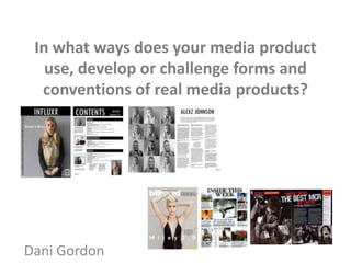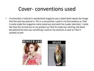 - Conventions used include placing text in a black box (from Wonderland magazine), writing text down the left page side (from Dazed magazine), using headings on the contents page, and introductions on double page spreads.