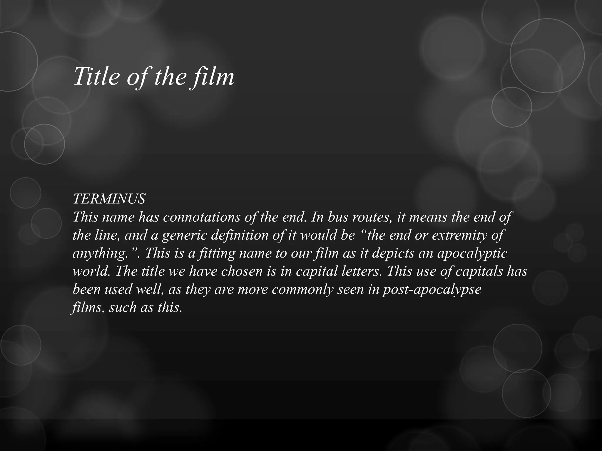 1) The title "Terminus" which connotes the end and was chosen to depict the apocalyptic world.