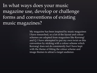 The document discusses how the author's music magazine both adapts conventions from existing magazines like Kerrang! and Q, while also putting their own twist and focusing on a niche genre. Specifically: