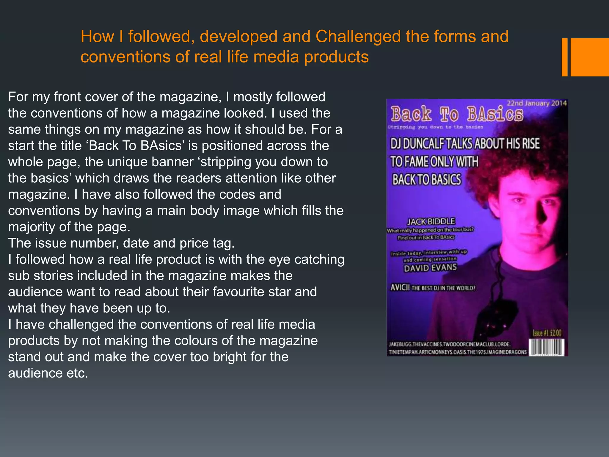 1. The front cover of the magazine follows conventions of real magazines by including the title across the top, a banner, and a large main image. It also includes additional details like the issue number and price.