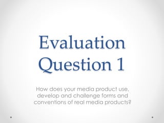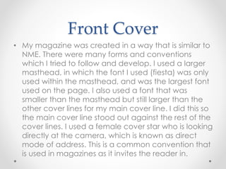 The document summarizes how the media product uses and develops conventions of real magazines. It describes using a large masthead font to stand out on the cover, including details like issue number and price, and featuring a direct gaze of the cover star. For the contents page, it lists articles and images like in the inspiration magazine Q, and includes a letter from the editor. The double page spread uses a styled title, kicker, large featured image, pull quotes and three column text layout typical of magazines, along with page numbers and branding logo.