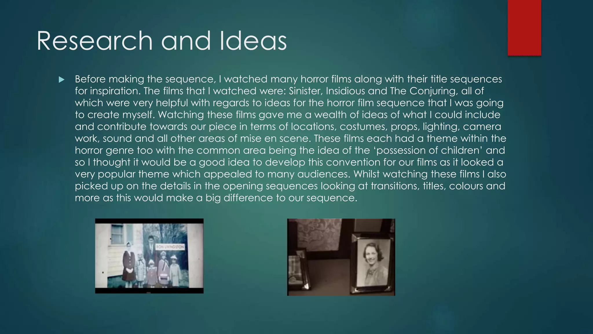 The document summarizes the research and creative process behind developing a title sequence for a horror film called "Third Time Around." The author watched title sequences from films like Sinister, Insidious, and The Conjuring to get ideas for locations, costumes, props, lighting, camera work and sound. Key elements incorporated from these examples include low-key lighting, ominous music, and diegetic sounds. The narrative focuses on the theme of demonic child possession. While conforming to horror conventions, the author also challenges some, like including more action shots over written text and changing between two points of view during the sequence.