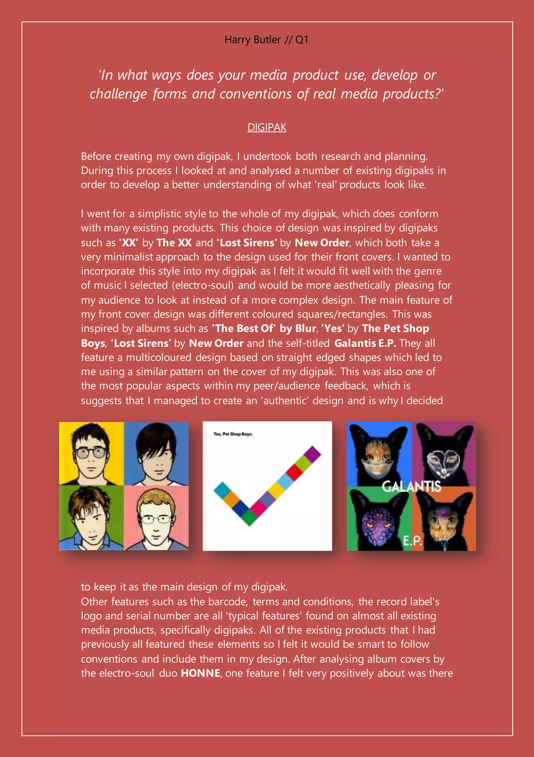 This document summarizes Harry Butler's media project analyzing how it uses, develops, and challenges conventions of real media products. Harry created a digipak, magazine advertisement, and music video. For the digipak, Harry researched existing digipaks and incorporated typical design elements but challenged conventions by including Japanese text. The magazine ad featured typical elements like album art but included uncommon copyright information. Harry's music video opening conformed to displaying the artist name but challenged conventions by including a Japanese translation. It also featured the artist singing while making eye contact, conforming to the video for "Another Love" by Tom Odell.