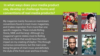 The document discusses how the student's magazine product uses and develops conventions of real music magazines. Specifically: