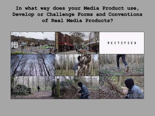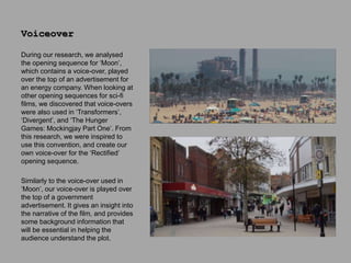 The document discusses how the media product's opening sequence uses and develops conventions of real sci-fi films while also attempting to challenge some conventions. It examines elements like voiceovers, fonts, costumes, props, locations, credits/titles positioning, and music. For most elements, conventions of the sci-fi genre were followed, but the location in a forest aims to be less conventional by portraying a realistic, post-apocalyptic setting rather than urban or space environments common to sci-fi.