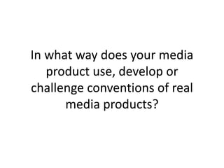 The document discusses how the media product challenges conventions of real music videos. It uses a narrative storyline with three characters: a girl, her boyfriend, and a stalker who follows the girl, making her appear scared. This challenges conventions by not always showing the main character happy. The performance features the singer standing still and side-on, facing the distance, rather than toward the camera as most do. The pace matches the song's beats with short shots during faster parts, following conventions while also using atypical shots in Shaun Mendez's "Stitches" video.