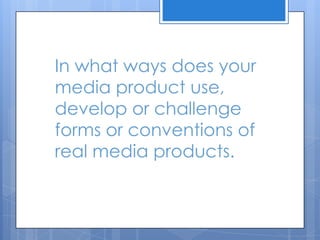 Our media product develops conventions found in typical rap music videos through editing, setting, and mise-en-scene. We use shots and editing styles seen in other rap videos to distinguish our video as a rap genre. We start with an establishing shot of an estate to set the location and background of the artist, as is common. Our clothing choices and inclusion of a car also conform to displaying wealth and "hood" image. However, we go against some conventions by not using jewelry props and including still shots rather than solely performance shots.