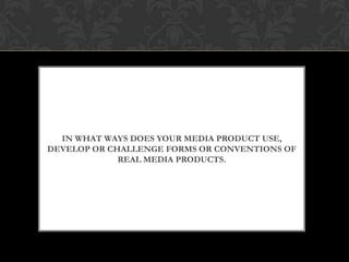 Our media product develops conventions of rap music videos through editing, setting, and mise-en-scene. We use editing techniques like split screens that are common in rap videos. An establishing shot sets the scene in an estate, a frequent setting in UK rap videos. Mise-en-scene features baggy clothing and body warmers projecting a "hood" image, as seen in many rap videos. However, our video challenges conventions by not showing off jewelry and using still shots rather than performance-based shots typically seen in rap videos.