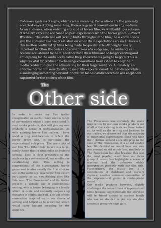 The document discusses how media products can use, develop, or challenge conventions and codes of existing media genres. It notes that while following conventions gives audiences familiar expectations, being too predictable loses their interest. The key is meeting expectations while also innovating to keep audiences engaged. The response describes how its horror film trailer and promotional materials use conventions like setting and props to identify the genre, but aim to challenge expectations somewhat by having a story about teenage girls rather than a family. It also discusses how conventions were followed for the poster, magazine cover, and elements of the trailer while striving to maintain some uniqueness.
