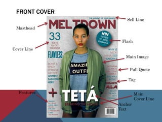 The document discusses the conventions of magazine design, particularly in the context of a music magazine's cover, contents page, and double-page spread. It elaborates on various elements such as masthead, main images, sell lines, and content layout, explaining how these adhere to or diverge from traditional magazine standards to engage audiences. The use of design choices is framed around audience connection theories, demonstrating an understanding of how visual elements can attract and retain reader interest.