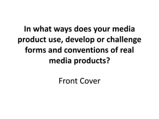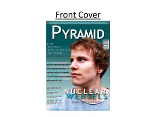 This document discusses how the media product, a music magazine called Pyramid, uses and develops conventions of real music magazines in its design. It has a close-up front cover image that challenges conventions by having the subject look away from the camera. It uses a single bright color like indie magazines. There is limited catchy text on the cover following conventions. The masthead is centered at the top like other magazines and the name Pyramid references the music scene and targets hipster fashion trends.