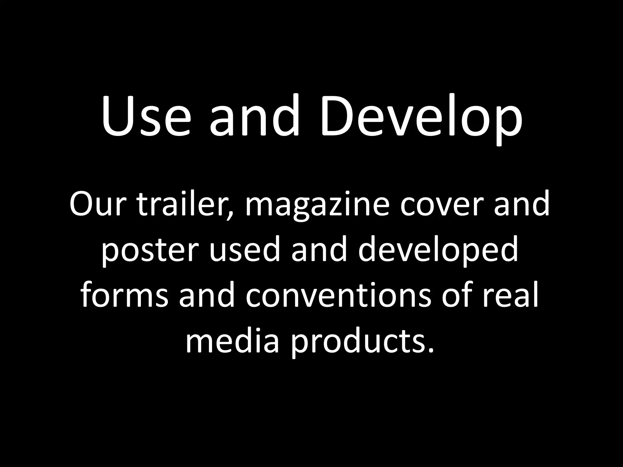 This document discusses how the media product uses, develops, and challenges conventions of real media. It summarizes that the magazine cover, poster, and trailer developed conventions like large mastheads, relevant headlines, close-up character images, and use of red color. However, it also challenged conventions by including star ratings on the poster and using minimal dialogue in the trailer without a spoken narrative. Market research was conducted to understand audience preferences and satisfy their expectations.