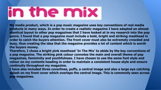 This document summarizes how the media product, a pop music magazine, uses conventions of real pop magazines. Key conventions included are a bright pink masthead to catch attention, three coverlines and a central image on the front cover. The mode of address is informal and chatty to relate to teenage girls aged 14-16. Images are clean cut and professional looking to portray a happy, fun magazine. Puffs and free posters are included to entice readers. Formats like barcodes and pricing are used to look like a real magazine without challenging conventions of the pop genre.